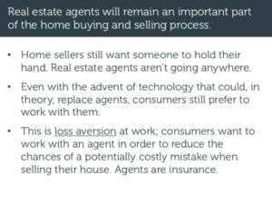 Mike talks about the human factor in real estate transactions. In the slide below, it clearly defines not only that the customer wants a human involved in the transaction, it tells us why. In the CNE course, we talk about Fear of Loss as a major influencer in human behaviour and bullet point three clearly spells out one of the major values that a great REALTOR® brings to the real estate transaction.