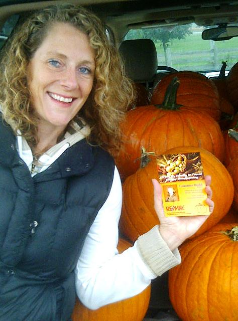 My good friend, Julianne Budd spent much of her week picking, washing and delivering pumpkins. We were having a good laugh together yesterday as she took time away from her super busy real estate practice to play farmer. Here’s the scoop – Julianne hand delivered over 360 pumpkins to people in the area she works. “It was an incredible opportunity to reconnect with past clients, establish some new relationships and remember how amazing my community is!” said Julianne. “It was such a great feeling to be there, face to face and share a smile, a story and in some cases, a dream. “ Who thinks this may bring Julianne more business than a Facebook page?